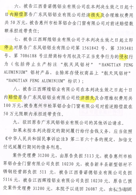 漳州凤铝系列维权案:诉辉煌公司等四被告,法院判赔250余万