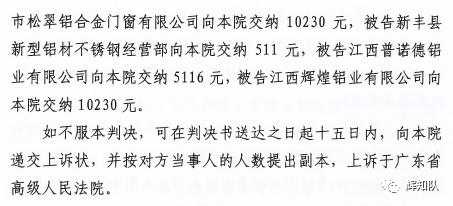 漳州凤铝系列维权案:诉辉煌公司等四被告,法院判赔250余万